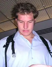 Following the 2002 year-end tour to Europe,[5] Williams became a regular member of the All Blacks. He started in all three matches against touring Northern Hemisphere teams, in June 2003, though he could have missed the games against Wales and France, after being cited for stamping on the head of England fullback Josh Lewsey;[6] he was cleared of the charge when a disciplinary tribunal ruled that his actions had been "inadvertent and incidental".[7] He started in all four matches in the 2003 Tri Nations Series, before being chosen in the All Blacks squad for the 2003 Rugby World Cup. He almost did not make the squad, after suffering a stress fracture of the right foot during the All Blacks training camp in New Plymouth, an injury that required the insertion of a pin, but was included on the strength of his line-out play.[8] He was rested for the first two pool matches, against Italy and Canada, but started in the remaining five games that New Zealand played, scoring his first international try in the final pool game, against Wales, when he jumped above the Welsh wing Shane Williams, to collect a cross-field kick from Carlos Spencer.[9][10] French back, and newspaper columnist, Thomas Castaignède named Williams and England's winning captain, Martin Johnson as the locks in his "team of the tournament".[11]