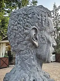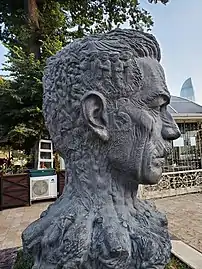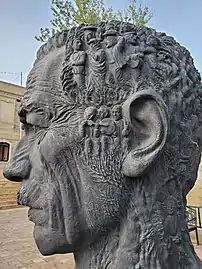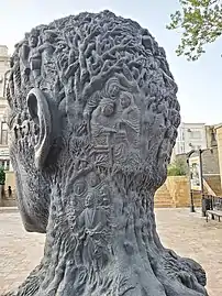 Architects Sanan Salamzade and Jahangir Mammadov commissioned me to create a statue of Aliagha Vahid in 1989. Having thought about this a little bit, I made a model of the statue out of plasticine. When we look at the appearance of the statue, we see different episodes separately. It depicts Vahid's wedding party. He is attending his wedding. On the left side of the head is a mugham trio, which is equal to the size of its ear. This is a sign of the inseparability of the national music, mugham, and ghazal. On the other side is Vahid's funeral: Women in headscarves are mourning. At the back of his head, friends and colleagues of the poet are reciting poems and singing ghazals. Aliagha Vahid, Huseyn Javid, Mikayil Mushfig, Jafar Jabbarly, Azer Buzovnaly, Sattar Bahlulzade are also around the table. As Vahid was a lover of Fuzuli, the image at the bottom of the head depicting the assembly is an evidence of that. We human beings - both geniuses and ordinary people - are dust and to dust we will return. In the statue, the poet's head takes root, growing like a tree. The world is falling apart and changing caused by earthquakes, but the Earth remains forever. These trees are also growing on it. This is what is Vahid’s secret. The philosophy of life of a ghazalkhan.