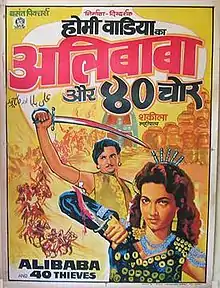 Alibaba and 40 Thieves (Alibaba Aur Chalis Chor) is a 1954 Hindi/Urdu fantasy action film directed by Homi Wadia. The film was a Basant pictures presentation under the Wadia Brothers Production banner.[1] The story, screenplay and additional dialogue were by JBH Wadia, while the dialogues were written by Chand Pandit and Tahir Lucknavi.[2] The art direction and special effects were by Babubhai Mistry. The music was composed by Chitragupta and S. N. Tripathi. Chitragupta had worked as an assistant to S. N. Tripathi in some of the mythology and fantasy films before branching out on his own. The lyricist was Raja Mehdi Ali Khan.[3] The film starred Mahipal, Shakila, B. M. Vyas, S. N. Tripathi, Sharda, Lalita Kumari and Helen.[4] The song sequence of "Dekho Ji Chand Nikla" was shot in Gevacolor.