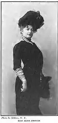 Alice Johnson (born 1860, died New York City, November 25, 1914) was a Broadway actress and singer,[1] active at the beginning of the 20th century.[2] She began her career in the chorus in light opera.[3] She later became a member of the Murray Hill Theatre Stock Company. In a single season she was seen in "no less than thirty roles running the entire gamut of the modern stage."[1] The company was founded by Henry V. Donnelly (1862–1910).[4] The company gave two performances daily and changed the play each week. Alice played everything from Lady Macbeth to Peggy in A Tin Soldier by Temple Bailey.[3]