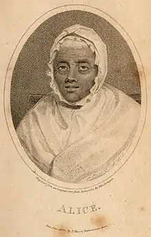 Thus, Alice became one of America's earliest oral historians, and a vibrant source of information for those who had the chance to speak with her.[2] Although, like most enslaved people, she was unable to read or write, she loved to have the Bible read to her,[1] and was respected for having 'a great regard for truth'.[2] Alice was said to have lit the pipe of William Penn, 'founder' of Pennsylvania,[2] and to have made the acquaintance of Thomas Story.[1] In his Eccentric biography; or, Memoirs of remarkable female characters, ancient and modern, Isaiah Thomas (founder of the American Antiquarian Society) wrote that: