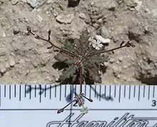 It is a small herb producing a thin, branching stem up to about 23 centimeters tall. It is coated in glandular hairs. Several deeply lobed leaves 1 to 6 centimeters long are located in a basal rosette at ground level around the stem. There are smaller, unlobed leaves along the stem. The inflorescence produces one to three flowers, each about half a centimeter wide with a thread-thin tube. The corolla is purple-stained white, the throat is yellowish, and the tube is purple.