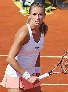 In 2018, her first significant performance was at the Premier Dubai Championships where she reached semifinal.[11] Two weeks later, she reached semifinal of the Ladies Open Lugano.[12] At the Madrid Open, she reached quarterfinals.[13] Her grass-court season was successful. She started with the title at the Nottingham Open as her first grass title.[14] At Wimbledon, she reached her first significant Grand Slam result, reaching semifinals.[15] Partnering with Abigail Spears, she lost to eventual champions Barbora Krejčíková and Kateřina Siniaková.[16] She also reached semifinals at the Premier Connecticut Open[17] and quarterfinal of the Premier Mandatory China Open.[18] At the WTA Elite Trophy, she played alongside Mihaela Buzărnescu and won first match in the round-robin stage but then lost to the following one.