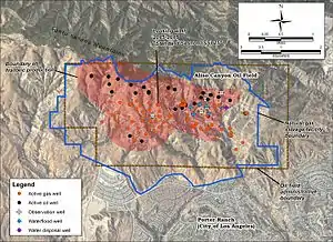 Land uses in the vicinity of the field include industrial (for the oil and gas field itself), open space, parkland, and residential to the south. Areas to the west, north, and east in the Santa Susana Mountains have been identified as Significant Ecological Areas.[4] The Michael D. Antonovich Open Space Preserve abuts the field on the northeast, and numerous parks in Porter Ranch are adjacent on the south.[5]