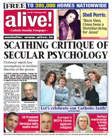 Alive! is a free monthly publication in the style of a newspaper which has been produced since its first edition in 1996 by Alive Group, an organisation with an address at the Dominican Order St Mary's Priory, Tallaght in Dublin, Republic of Ireland. The current editor is a Catholic priest, Fr Brian McKevitt, who refers to the publication as a 'newszine'. While it claims a circulation of 240,000 copies, its actual readership is difficult to establish since a substantial portion of its circulation is delivered door-to-door, with most of the remainder being available through Ireland's network of Catholic churches (who do not provide estimates of take-up).[1] It is printed by Datascope, an independent publishing company in Enniscorthy and contains an appeal in each issue for donations totalling €160,000 annually to remain in circulation.[2]