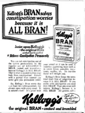 With the rising popularity of patent medicine in advertising, The Kellogg Company of Canada published a book named A New Way of Living that would show readers "how to achieve a new way of living; how to preserve vitality; how to maintain enthusiasm and energy; how to get the most out of life because of a physical ability to enjoy it." It touted the All-Bran cereal as the secret to leading "normal" lives free of constipation.[2]