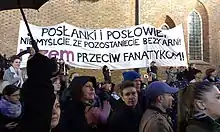 During the protests, some Roman Catholic churches across Poland were graffitied and masses (liturgical services) were disrupted.[14] The protesters also blocked streets across several cities.[15] In response to an interviewer's statement that graffiti and mass interruptions were unnecessary, Lempart stated, "Of course that's needed. You should do that which you feel, which you judge is effective, and that which they deserve."[13]