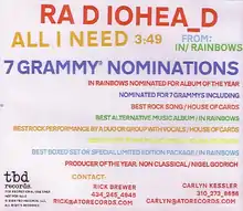 - "All I Need" (single). Radiohead. TBD Records. 2009.
