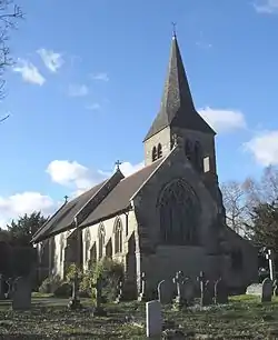 All Saints Church, characterised by architectural historian Nikolaus Pevsner as "a serious job, outside and inside",[8] is a Gothic Revival-style building, variously described as in the Decorated style of around 1300,[1] "Early Geometrical" (i.e. a 19th-century interpretation of the transition between Early English and Decorated Gothic)[7] and "15th-century Gothic".[13] It has a chancel and nave with a chancel arch between them, an aisle on the north side of the nave, a porch on the south side and a northeast tower topped with a broach spire laid with oak shingles.[1][2][8][13] The whole church is built of local stone.[7]