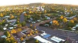 ![]() Aerial view of Richmond Hill, looking from the intersection of Bridge Street with Hackett Terrace (lower right) and then SSW along the curve of Bridge Street with Mosman Street in the centre of Charters Towers and Towers Hill in the distance | |||||||||||||||