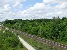 The Munich North marshalling yard - a large displacement and container station, was built on the southern edge of the Allacher Forest in 1991.[3] This led to criticism from conservationists since 174 hectares of biotope area was destroyed. On a 5 km long and 500 m wide area, with 356 connections and over 120 km of tracks, up to 4000 railway cars are handled there every day.[1] The Allacher Forest is now a rare riparian forest, that after massive protests from the population and the experts, the A99 motorway ring Munich Northwest crosses under the Allacher Forst in the so-called Tunnel Allach.