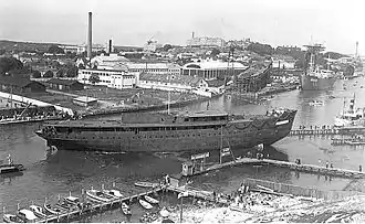 Simultaneously with the submarine projects, the yard worked already on two 3 800 ton coastal defence ship projects. Crichton-Vulcan signed contracts for the ships in November 1928. Building of such large and demanding ships required investments in facilities and cranes; also the number of employees was increased. The first one of the ships, Väinämöinen, was launched in December 1930 and Ilmarinen followed in July 1931.[7]
