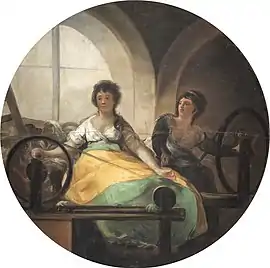 Allegory of Industry is a tondo painted by Francisco de Goya (c. 1805) which was one of the four paintings from a series of allegories about scientific and economic progress (including the Allegory of Agriculture, Allegory of Commerce, and Allegory of Science, the latter of which has been lost), which decorated a waiting room of the residence of Manuel Godoy, Prime Minister of Spain during the reign of Charles IV. Since 1932, the picture has been in the Museo del Prado. The image shows two young women as they thread their respective spinning wheels in a semi-darkened room, illuminated by a large window which opens from the left (from the point of view of the observer). At the back, in the dark, one can discern uncertain faces of old women (who have been linked to the Fates). The uncertainty of these women doesn’t reveal whether or not they are factor workers or representations of the tapestry or canvas.