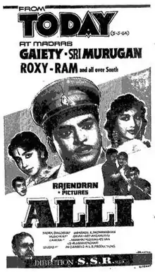 Alli is a 1964 Indian Tamil-language film produced and directed by S. S. Rajendran. He also stars along with R. Vijayakumari and Sowcar Janaki playing the title character. The film was released on 5 March 1964.