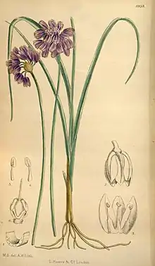 Allium sikkimense is a plant species native to Sikkim, Tibet, Bhutan, Nepal, India and parts of China (Gansu, Ningxia, Qinghai, Shaanxi, Sichuan, Xizang, Yunnan). It grows in meadows and on the edges of forests at elevations of 2400–5000 m.[2] The species is cultivated as an ornamental in other regions because of its strikingly beautiful blue flowers.[3][4][5] It is used medicinally in the Sikkim Eastern Himalayas. [6]