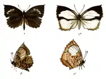 Female upperside: white. Forewing: apical, terminal and tornal areas black, the inner margin of the black commences just before the middle of the costa, and runs obliquely outward in a sinuous curve to base of the apical fourth of vein 2, thence it is produced for a short distance inwardly along that vein and terminates at the middle of the dorsal margin. Hindwing: a broad black stripe along the costal margin; the termen somewhat narrowly pale yellowish-brown. Underside white, the markings somewhat variable. Forewing: costa, apex and termen with minute earthy-brown speckles, sparse along the costa, more dense on the termen; on the latter they coalesce and form a brown smudgy border that is bounded on the inner side by a curved, postdiscal, more or less clearly defined, narrow, yellowish-brown band; cell crossed transversely by a basal, a medial and an apical short similar band; the medial band darkened in colour and continued almost to the dorsum, the apical band along the discocellulars. Hindwing: with minute brown speckles, more or less lightly and irregularly stained with rusty brown; basal half with obscure, transverse, narrow, macular, earthy-brown bauds that are well-defined only anteriorly, the basal one produced up to the dorsum; a short dark-edged transverse band from the tornus to vein 4 running parallel to the costal margin, the lower edge of the band acutely and irregularly dentate; the terminal and tornal areas below this band washed with earthy brown. Antenna, head, thorax and abdomen as in the male but very much paler.[2]