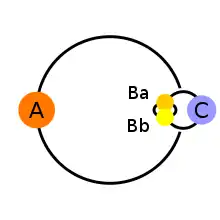 In October 1842, Wilhelm Struve found that γ2 Andromedae was itself a double star whose components were separated by less than an arcsecond.[18] The components are an object of apparent visual magnitude 5.5, γ Andromedae B, and an A-type main-sequence star with apparent visual magnitude 6.3, γ Andromedae C.[26] They have an orbital period of about 64 years and a high eccentricity (ovalness) of 0.927.[29] Spectrograms taken from 1957 to 1959 revealed that γ Andromedae B was itself a spectroscopic binary, composed of two B-type main-sequence stars orbiting each other with a period of 2.67 days.[31] The two orbits may be coplanar.[29] At present the angular distance between both stars is 0.16 arcsecond .