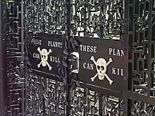 A garden featuring intoxicating and poisonous plants was added in February 2005. The garden was thought of by the duchess herself, who wanted the garden to have something that was different from other gardens. Species of the Poison Garden include Strychnos nux-vomica (source of strychnine), hemlock, Ricinus communis (source of harmless castor oil but also deadly ricin), foxglove, Atropa belladonna (commonly called Deadly Nightshade), Brugmansia and Laburnum.[3] The mission of the Poison Garden also includes drug education, with featured plantings of cannabis, coca and the opium poppy Papaver somniferum.[4] The poison garden is now one of the main reasons that people visit the gardens.