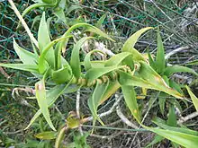 The fleshy leaves themselves are strongly recurved (helping to anchor the tall stems in dense thickets and assist the plant in climbing). The leaf sheaths are conspicuously striped green and white.
