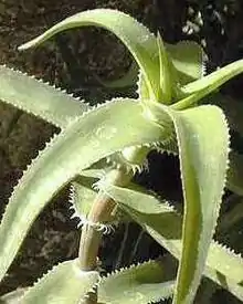 They can be differentiated from other Aloiampelos species by the way that the soft, white, hair-like teeth (=ciliaris) that grow along the margins of the leaves, extend all the way around the stem, at the base of the leaf.