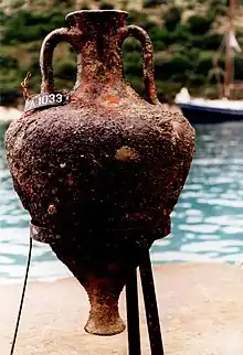 In 1985 a Greek fisherman discovered a large Classical shipwreck at Alonnisos in the Northern Sporades near the islet of Peristera and declared it to the Greek Department of Maritime Antiquities. Department personnel conducted a survey in 1991 under the Director of the department Elpida Hadjidaki.[1] The wreck was marked by thousands of amphorae forming a mound 25 m by 12 m and clearly indicating the shape of the ship. The upper layer was jumbled, but the lower layer appeared relatively undisturbed. The size of the mound indicated that this shipwreck was twice as large as any other shipwreck of the Classical period discovered at that time.