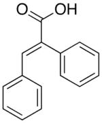 There are many ways to synthesize α-phenylcinnamic acid. Some of the more popular methods of formation include the condensation of phenylacetyl chloride with benzaldehyde in the presence of triethylamine, the distillation of benzylmandelic acid, or by the reaction of sodium phenylacetate with benzaldehyde in acetic anhydride.[3] There are two isomers of this compound, differing in the geometry of the alkene. The E isomer, in which the two phenyl rings are cis to each other, is the major product formed by most synthetic routes. However, this compound can be converted using heat or ultraviolet light into a mixture containing nearly 50% of the Z isomer.[4] Decarboxylation of α-phenylcinnamic acid yields stilbene, with the (E) isomer producing cis-stilbene and the (Z)-isomer producing trans-stilbene.[5]