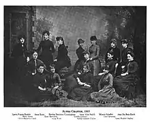Association with the music school was required early on, as the fraternity only allowed School of Music students. Later on, this was changed and the minimum requirement became registration in one music course of any kind. Members then graduated in many other departments of the university, including the liberal arts department.[6] In 1889, a national literary fraternity offered to merge with Alpha Chi Omega; however, unlike professional fraternities, Alpha Chi never considered taking members of other fraternities.[6] In its early years it was externally considered to be a professional music society,[7][8] but due to disagreement with this designation, in 1900, the sorority added literary qualifications, which led to it being considered a general (social) sorority by 1905.[9]