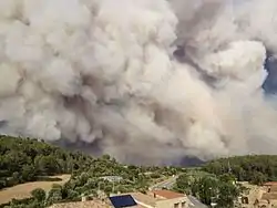 The 19 municipalities affected were as follows: la Jonquera, Agullana, Darnius, Boadella i les Escaules, Terrades, Vilarnadal, Avinyonet de Puigventós, Vilafant, Figueres, Llers, Pont de Molins, Biure, Masarac, Cabanes, Sant Climent Sescebes, Capmany, Cantallops, Vilanant i Cistella.[1] The smoke and smell of the fire was encountered in Barcelona as well as further south.[14] Smoke was also seen around Céret, France.