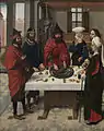The Last Supper is the theme of the central panel of the altarpiece, commissioned from Bouts by the Leuven Confraternity of the Holy Sacrament in 1464. All of the orthogonals in this composition display an understanding of linear perspective.[1] The lines lead to a single vanishing point in the center of the mantelpiece above Christ's head, though outside the room, the small side room has its own vanishing point, and neither it nor the vanishing point of the main room falls on the horizon of the landscape seen through the windows.
