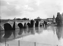 Alte Brücke (German: "old bridge") is a bridge in Frankfurt, Hesse, Germany. It is the oldest bridge over the lower course of the river Main, and until 1886 was the only stone bridge crossing the river. From the Middle Ages until the year 1914, it connected the "Fahrgasse" in Frankfurt Altstadt with the "Brückenstraße" in Sachsenhausen. Since its first mention in official documents in 1222, the development of Frankfurt has been strongly influenced by the bridge. Over the centuries, Alte Brücke has been destroyed and reconstructed at least 18 times. With its 13 brick-built circular arches, the Sachsenhausen Bridge was one of the most prominent buildings of the city, but failing to meet the increasing demands of the modern road and ship traffic, it was demolished in 1914.