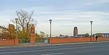 In 1996, all the damage to the Alte Brücke that had accumulated over time was repaired in a makeshift. In December 2000, the city countil conference mandated a fundamental renovation of the whole bridge. The correlated architect competition of 2001 was won by Christoph Mäckler, with a design proposal that emphasized the historical elements of the bridge. In 2004, the city countil conference decided to let the renovation start shortly after the 2006 FIFA World Cup.[14] However, the construction work was delayed to be synchronized with the reconstruction of the Kurt-Schumacher-Straße (Kurt Schumacher road), avoiding prolonged interference with private transport in the inner city. For some time, the beginning of the work was planned to be in the middle of 2009; the building costs have been estimated in the 2008 city budget plan to be about 29 million Euro.[15]