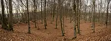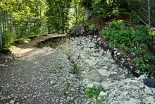 The tongue-shaped plateau of around 2 hectares is closed off towards the north east by two exterior ramparts, a deep moat and a large main rampart. Even today, the top of the main rampart is up to 12 meters above the bottom of the moat. Towards the valley the plateau is flanked by two terraces, 15 (north west) and 20 meters (south east) below the top. At the bottom of the slope another rampart and moat surround the hill. The entry to the fort was likely to the north east.[2]: 28