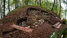 In 1894, an excavation was conducted that discovered the pit (see below) which was interpreted as a burial mound. A modern excavation followed in 2006/7 and discovered bone fragments that were dated to the 3rd or 4th century BC. Excavations have been resumed in 2014 and are ongoing.[2]: 28