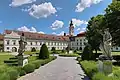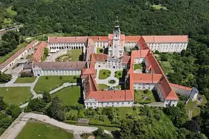 The abbey occupies a very large area with the front façade, which faces east, itself occupying a length of 200 m surrounded by a number of landscaped gardens.[1] The abbey complex has 12 identified areas of: 1. Fountain Court 2. Convent Court 3. Kitchen Court 4. Prelates Court 5. Church Court 6. Johann's Court 7. Great Abbey Court 8. Abbey Church 9. Library Wing (Crypt) 10. Marble Wing (Sala terrena) 11. Inner Medieval Monastery (Cloister) 12. Outer Medieval Monastery>[8]