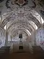 The library, built in 1740, is of Baroque architectural elegance,[9] an imposing room that rises to three stories in height. The library hall is 48 m (157 ft) long and its ceiling is decorated with frescoes crafted by Paul Troger. Among the many frescoes, the distinctive ones are the Judgment of Solomon, the Wisdom of God and the Light of Faith.[1] Beneath the library is a large crypt which is also decorated with many frescoes by unknown artists; one particular scene which is fierce in appearance is that of the Dance of Death.[1]
