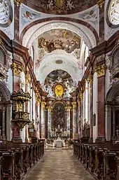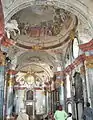 The church is oval-shaped and bears a dome. It was renovated in 1730–33 by Joseph Munggenast. The dome is also decorated with Troger frescoes. The main feature of the altarpiece is a painting Assumption of Mary, topped by a representation of the Trinity.[1]