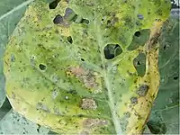 There are three main sources of infection: nearby infected seeds, spores from plant debris in the topsoil and Brassica weeds, and spores moved by wind and air from farther away.[3] Infected leaves can spread their spores up to a diameter of 1800m. There are also three major entry points to the host cell: epidermal penetration, stomatal penetration and penetration through an insect.[3] Contact with the host cell triggers the release of various cell wall degrading enzymes which allow the fungus to attach itself to the plant and begin degradation.[10] The suggested mode of attack is through host-specific toxins, primarily AB toxins, that induce cell death by apoptosis.[3] This results in what look like dents and lesions in the host plant.[3] These are brown, concentric circles with a yellow tinge at the circumference, usually about 0.5-2.5cm in diameter.[11][5][1] Necrosis can generally be observed within 48 hours of infection.[11] The spores can reside on the external seed coat of infected seeds, but the mycelium can also penetrate under the seed coat, where it has the ability to remain viable for several years.[1] Occasionally, it can even penetrate the embryo tissue.[6] The primary mode of transmission is through contaminated seed.[5] Also, the infection is not limited to specific areas of the host plant; it can spread all over and even cause damping off of the seedlings at a relatively early stage.[3] It also affects the host species at various developmental stages.[9] As mentioned above, seedlings exhibit dark stem lesions followed by damping off. Velvety, black spots, resembling soot, can be observed on older plants.[9] Pathogenesis is affected by factors such as: temperature, humidity, pH, reactive oxidation species, host defense molecules.[3]