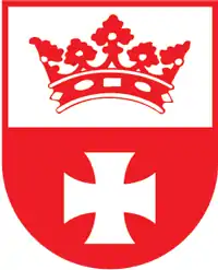 The oldest remaining seal of Altstadt depicted King Ottokar II of Bohemia, who had led the initial conquest of Sambia and was honored for his participation by having Königsberg named after him. Altstadt's coat of arms depicted a red crown in a white field above a white cross in a red field, with the crown honoring the Bohemian crown and the cross representing honoring the Teutonic Knights. Aside from being the colors of Bohemia, red and white also represented urban freedom.[5] It is unknown when the coat of arms were first adopted. Two lions were added to the arms as supporters in the 17th century.[6]