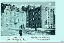 By 1487 the school had moved to the street Danziger Keller near Königsberg Castle.[4] The parochial school was expanded into a Latin school in 1525 during the Protestant Reformation. Because sunlight at the Danziger Keller building was partially blocked by one of the castle's towers, Altstadt's council approved the construction of a replacement school at Altstädtischer Kirchplatz (the later Kaiser-Wilhelm-Platz). The new school was built from 1592 to 1595 and dedicated on 14 August 1595.[4] It hosted the Königsberg Public Library from 1737 to 1773.