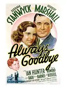 Always Goodbye is a 1938 American romantic drama film directed by Sidney Lanfield and starring Barbara Stanwyck, Herbert Marshall, and Ian Hunter.[1][2]