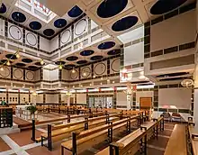 A stairway leads from the rooms on the ground floor to a central vestibule through which the church proper is accessible. This consists of a central space, with room for 220 people seated and 400 standing, in the shape of a Greek cross surrounded by an ambulatory delineated by concrete pillars. The cubic elements, which draw together in this space, terminate at the apex of the pyramid in a lantern of glass windows. The white interior, highlighted by green and golden ceramic tiles, is strongly reminiscent of the Jugendstil.