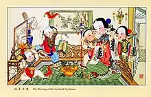 The word amah may have originated from the Arabic: أَمَةٌ, romanized: ʾamah meaning "female slave" or from the Portuguese ama meaning "nurse".[1] Some however argued that it is the English form of the Chinese word ah mah. Ah (阿; ā) is a common Chinese prefix used before monosyllabic names or kinship terms to indicate familiarity, and mah (妈; 媽; mā) means "mother". Others say that the word originated from the term for a wet nurse, nai mah (奶妈; 奶媽; nǎimā; 'milk mother').[2] This word is common in East Asia, Southeast Asia and South Asia to denote a maidservant or nursemaid.[3]