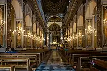 The bell tower was constructed between the 12th and 13th centuries in front of the first church, topped by an elaborate crown decorated with marble and majolica in the Arab-Norman style, also seen in other churches in southern Italy in this period. The chapels inside are variously Gothic and Renaissance, with the nave decorated in the Baroque style in the 18th century.