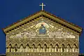 The front facade was rebuilt in the late 19th century in striped marble and stone, with a tall pediment decorated with mosaics, and a deep porch with windows of delicate Arab-Moorish tracery similar to, but more ornate than, the original.[4] The tympanum's mosaics portray “The triumph of Christ” in a work created by Domenico Morelli and whose original designs are retained in the Town Hall.