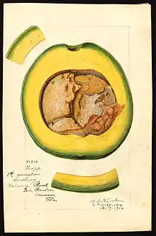 Newton's artwork for the USDA covered a wide range of fruit and nuts, principally apples, of which there are many hundreds of examples. There are also paintings of strawberries, plums, citrus, persimmons, avocados, and cherries, as well as fruits that are still not commonly grown in the continental United States such as loquat and baobab. Most of her watercolors show a whole and a half fruit in full color; a few (such as the strawberry and cherry paintings) show foliage as well. Her style is precise and detailed, combining vigorous lines with subtle color modulations. Newton signed her work 'A.A. Newton'.[5]