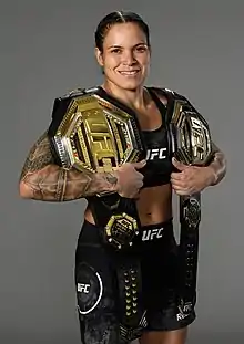 Widely regarded as the greatest female mixed martial artist of all time,[9] she is the first woman to become a two-division UFC champion, and the third fighter to hold UFC titles in two weight classes simultaneously, after Conor McGregor and Daniel Cormier. She is also the first and only fighter to defend two UFC titles while holding both.[10][11][12] As of December 13, 2021, she is ranked #1 in the UFC women's bantamweight rankings[13] and as of January 17, 2022, she is ranked #2 in UFC women's pound-for-pound rankings.[14]
