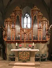 The organ solemnly inaugurated in 1766 was made by the renowned master organ builder Johannes Weinmar from Bondorf. It is richly decorated with figures of trumpeting angels and gilded arabesques. Originally it stood in its own gallery which, however, was removed during renovation work in 1898. On this occasion the pipes too were replaced by new ones more in accordance with the style of the times. In the second renovation in 1981, new pipes were again installed, this time with a view to reproducing as closely as possible the sound of the Baroque original.