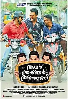 Amar Akbar Anthony is a 2015 Indian Malayalam-language comedy thriller film directed by Nadirshah and written by Bibin George and Vishnu Unnikrishnan. It stars Prithviraj Sukumaran, Namitha Pramod, Jayasurya and Indrajith Sukumaran. The music is composed by Nadirshah, while the background music is given by Bijibal. It was released on 16 October 2015.
