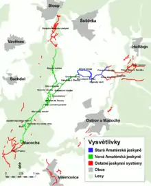 Amaterska Cave can be divided into 3 main parts: Sloupsky Corridor, Bila voda branch together with Old Amaterska cave and Macossky Corridor. Amatérská Cave can be entered by one natural entrance in Cikansky Sink Hole or through an artificial one under Konsky Spad in Pusty Zleb canyon.[2]