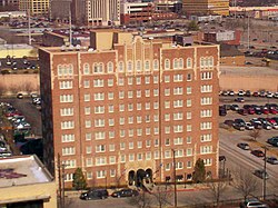 The hotel building currently has 55 guest rooms[4] and is located at the northwest corner of Main Street and 14th Street in Tulsa. It is included as a supporting item in the Riverview Historic District. Although the street address is given as 1324 South Main, the main entrance is actually on 14th Street, which runs along the south of the building. Constructed primarily of poured concrete columns and beams, it measures 120 feet (37 m) by 40 feet (12 m). It is 9 stories high and has a full basement. The ninth floor has a concrete slab ceiling. The building roof is flat and hidden from street view by a parapet. It was originally built on a wooden frame a few feet above the slab ceiling and was covered with asphalt. The frame was deteriorated beyond repair by 1999 and needed to be replaced. The replacement was to have a light steel frame.[5]